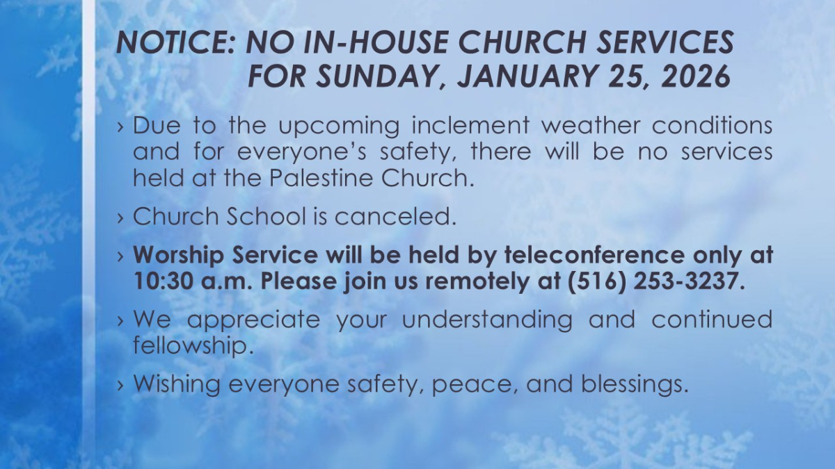 Or join us on our Teleconference Line at (516) 253-3237 for Sunday Church School, Sunday Worship Service and Bible Study.